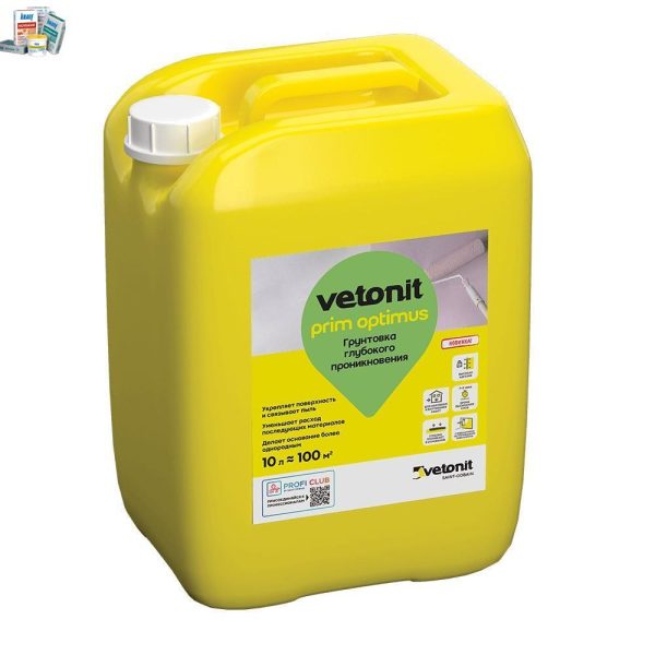 Грунтовка глубокого проникновения Vetonit Prim Optimus обладает высокой проникающей способностью, что позволяет укрепить поверхность и уменьшить ее впитывающую способность. Она также связывает пыль и другие мелкие частицы, обеспечивая чистую и ровную поверхность для последующих отделочных работ. Благодаря этому продукту, сцепление основания с отделочными материалами становится надежным, а поверхность защищена от образования плесени и грибка.