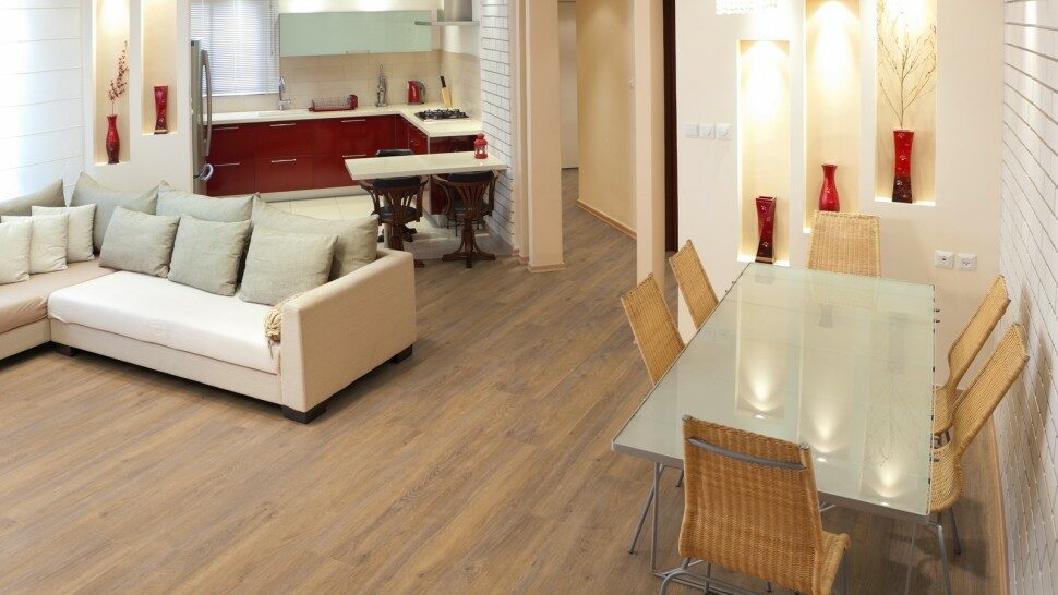 Система замков Clic обеспечивает легкость укладки и надежное соединение плит между собой. Ламинат устойчив к ударам, высокой нагрузке, острым предметам, не выгорает на солнце и совместим с системой теплый пол.