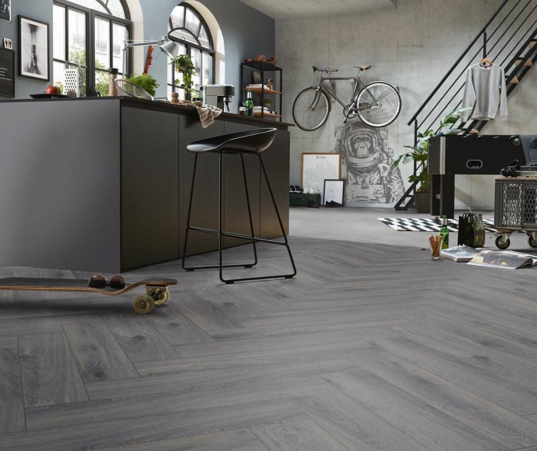 Этот ламинат представлен в 33 классе износостойкости, что делает его идеальным для коммерческих помещений. Он имеет стильный серый цвет и классический узор Herringbone, который подойдет для любого интерьера.