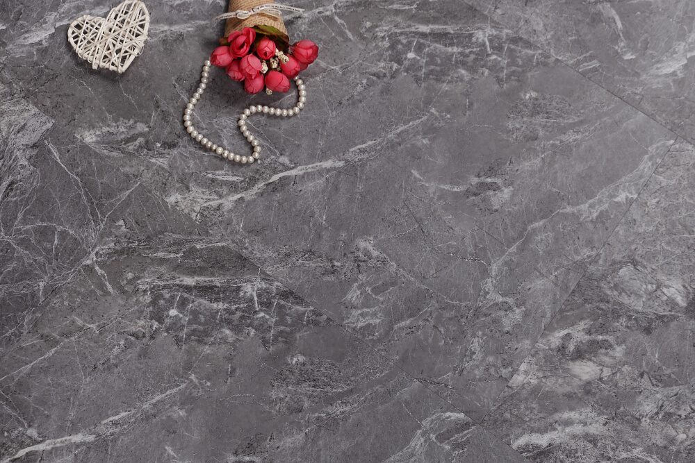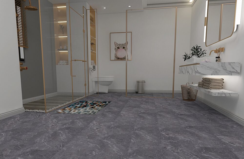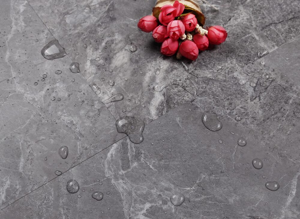 Плитки ламината имеют размеры 620 мм в длину и 310 мм в ширину, имитируя рисунок натурального камня. Этот материал отлично подходит для влажных помещений, таких как ванные комнаты и кухни.